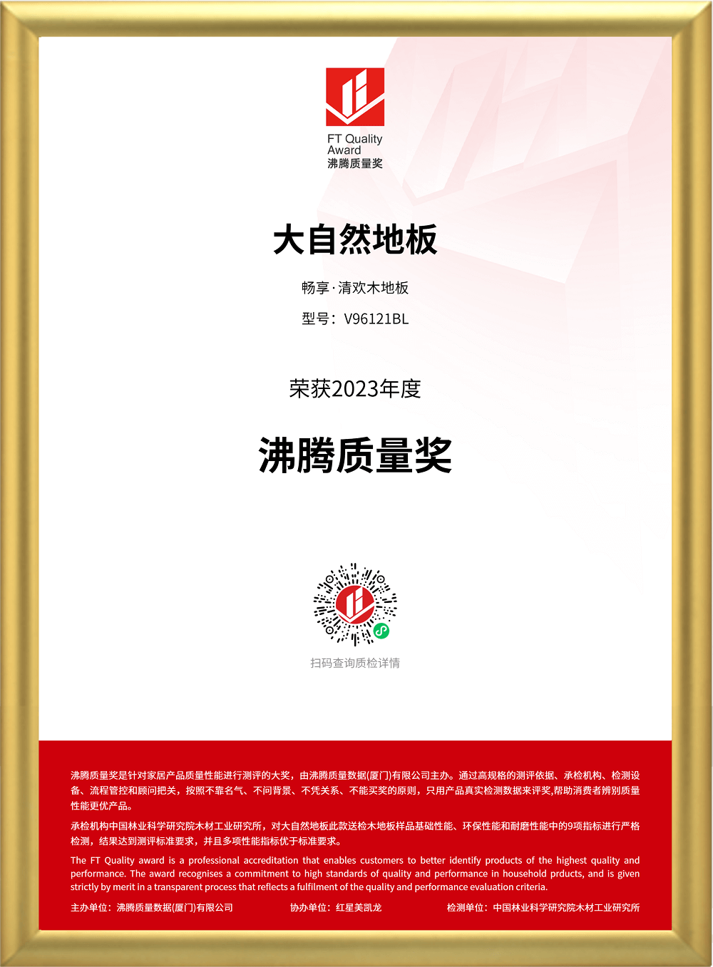 在2023沸騰質(zhì)量獎(jiǎng)測評中,大自然地板參評的暢享·清歡木地板(V96121BL),經(jīng)過承檢機(jī)構(gòu)中國林業(yè)科學(xué)研究院木材工業(yè)研究所的檢測,通過了基礎(chǔ)性能、環(huán)保性能和耐磨性能等9項(xiàng)指標(biāo)測評,結(jié)果達(dá)到測評標(biāo)準(zhǔn)要求,且多項(xiàng)性能指標(biāo)優(yōu)于標(biāo)準(zhǔn)要求,獲得“沸騰質(zhì)量獎(jiǎng)”。其中,檢測報(bào)告顯示,該地板甲醛釋放量僅為0.009毫克每立方米,遠(yuǎn)遠(yuǎn)低于檢測規(guī)定值(0.025毫克每立方米),環(huán)保性能佳。