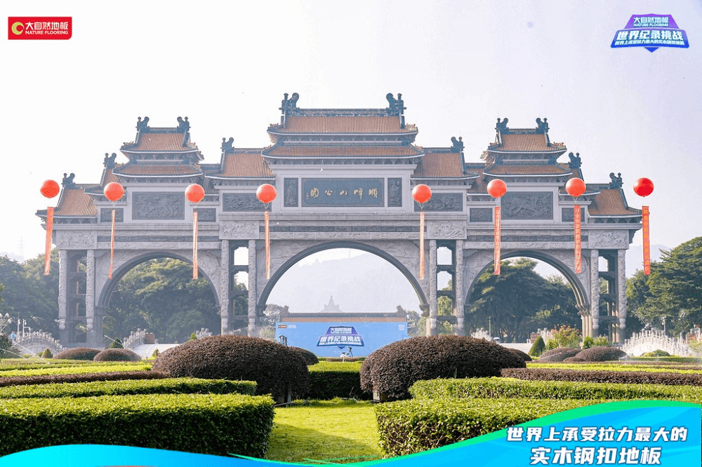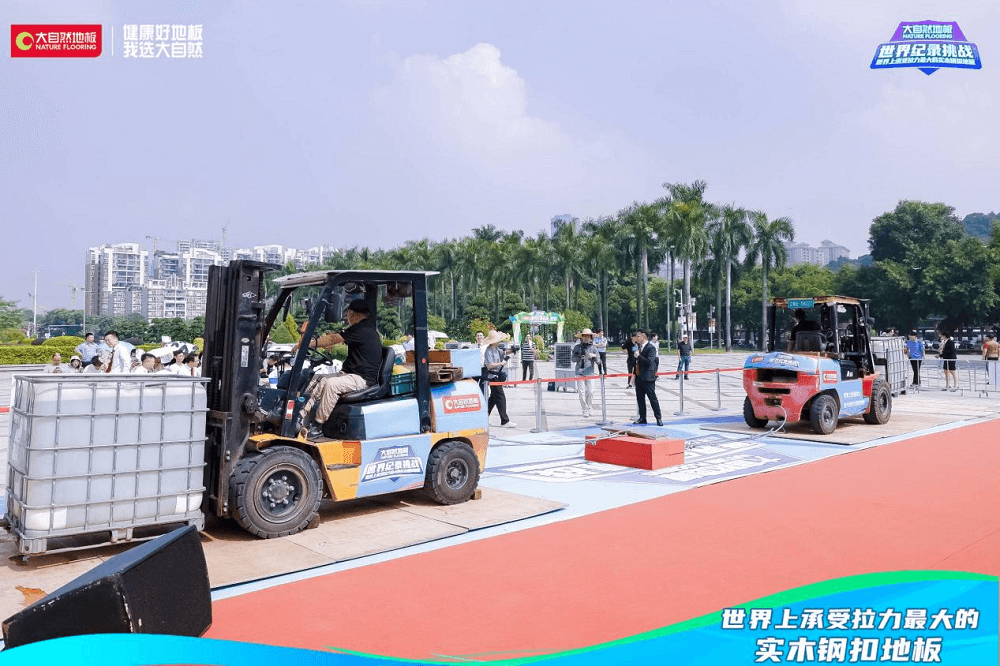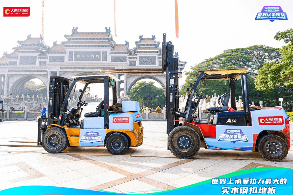 金秋十月,順峰飄香。在萬眾期盼中,大自然地板攜手福布斯FWRC世界紀(jì)錄認(rèn)證機(jī)構(gòu),發(fā)起的“世界上承受拉力最大的實(shí)木鋼扣地板”世界紀(jì)錄挑戰(zhàn)活動(dòng),在亞洲最大的牌坊——佛山順德順峰山公園牌坊盛大開啟。當(dāng)天早上,兩輛重量高達(dá)5噸的叉車擺好“陣勢”,引來現(xiàn)場觀眾駐足觀看,線上直播同步進(jìn)行,組成線上打call團(tuán),共同見證。