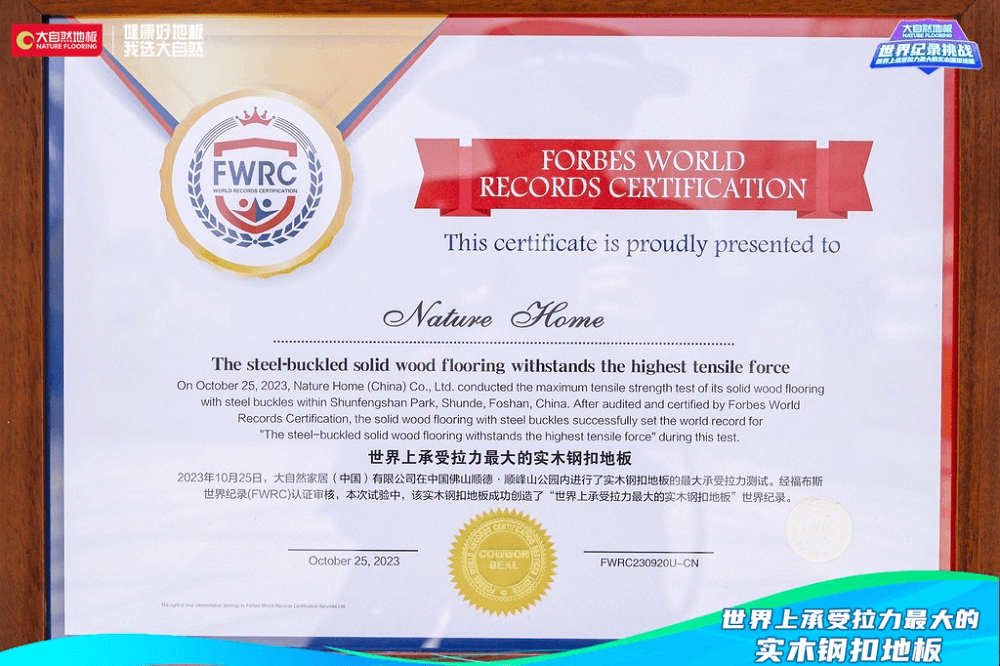 經(jīng)福布斯世界紀(jì)錄認(rèn)證官方機(jī)構(gòu)認(rèn)證官現(xiàn)場記錄并宣布:大自然實(shí)木鋼扣地板最大的承受拉力為12806N,世界上承受拉力最大的實(shí)木鋼扣地板——大自然地板世界紀(jì)錄挑戰(zhàn)成功。隨后,在全體嘉賓、媒體、現(xiàn)場觀眾和線上廣大消費(fèi)者的見證下,福布斯世界紀(jì)錄認(rèn)證官方機(jī)構(gòu)認(rèn)證官為大自然家居授予世界紀(jì)錄稱號獎(jiǎng)牌,現(xiàn)場掌聲雷霆,歡呼爆發(fā)。