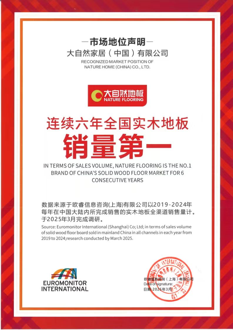 根據(jù)市場權(quán)威數(shù)據(jù)印證了這一戰(zhàn)略成效:歐睿國際2024年度報告顯示,大自然實木地板連續(xù)6年(2019-2024)榮膺“全國實木地板銷量第一”和“全球?qū)嵞镜匕邃N量第一”的榮譽,這一成就詮釋了商業(yè)價值與生態(tài)價值協(xié)同共生的典范。