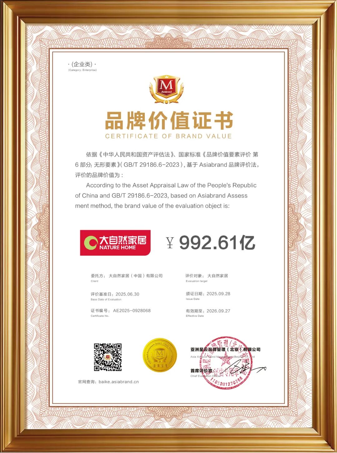 2025年9月27日-28日,由專業(yè)品牌評價機(jī)構(gòu)Asiabrand發(fā)起主辦,中國亞洲經(jīng)濟(jì)發(fā)展協(xié)會、一帶一路總商會、東盟-中國工商總會和亞太第一衛(wèi)視聯(lián)合主辦,被譽(yù)為亞洲品牌界年度“奧斯卡”的第20屆亞洲品牌盛典在中國香港舉行。 此次盛典上,大自然家居比肩一眾全球頂尖品牌,再次問鼎“亞洲品牌500強(qiáng)”,獲評“亞洲(行業(yè))十大領(lǐng)軍品牌”和“亞洲(行業(yè))消費(fèi)者信賴品牌”,品牌價值躍升至992.61億。這是大自然家居自2018年登榜后,蟬聯(lián)上榜的第8年。